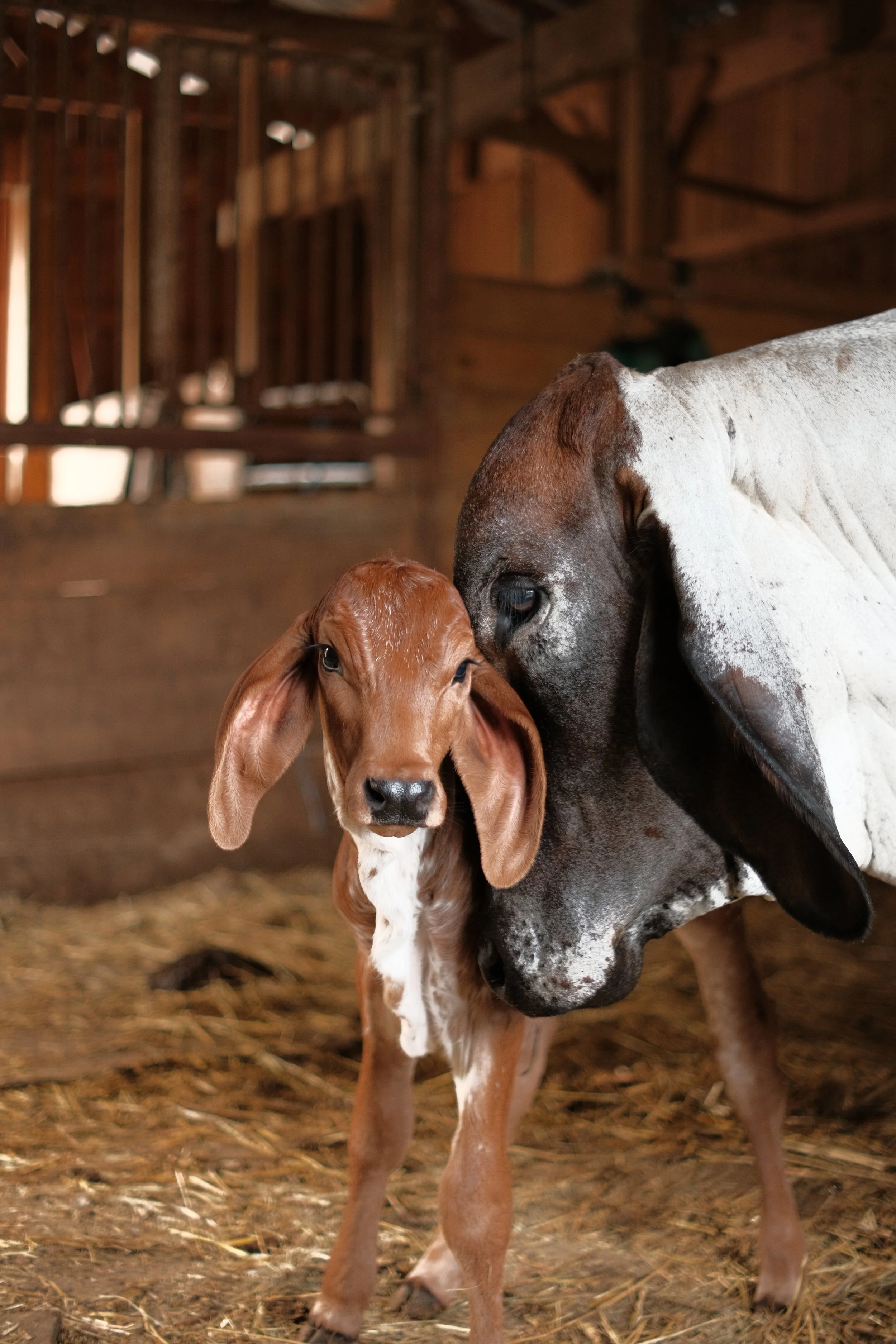 They are the big heart beats of the farm and everyone that visits leaves talking about the Bos Indicus long ears!! These breeds of cattle are native to India where they are sacred and used in dairy production. They are a very intelligent breed and family oriented. When a baby is born, you will often see every member of the herd lick the baby and surround the newborn, even the bull! It’s a great and loving welcome to the world. After the first week of living an “Aunt” in the herd becomes the baby’s best friend. They often stick together unless the baby is nursing on momma. They are truly a magical breed and we are blessed to have them. Our Sardo/Gyr herd is select and small with the intention of spending a lot of quality time with each and every one on a daily basis. We sell this breed as pets/show quality cattle and only offer four calves a year.